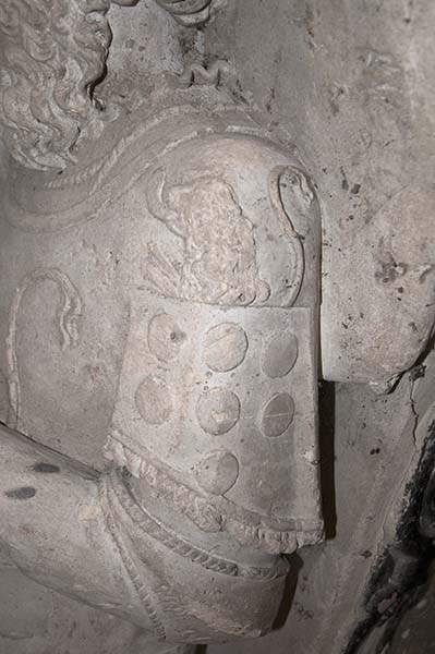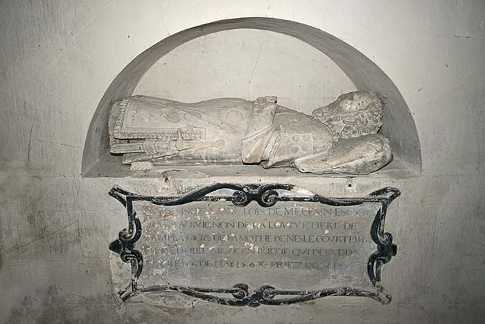 gist noble homme Loys de Meleun escuier sieur du Bignon de la Loupvetière de Dampnemois de la Mothe de Nesle Courtery et de Pierre-Aygue en partie - qui decedda le XIIe jour de may 1568 - Priez Dieu pour luy." |