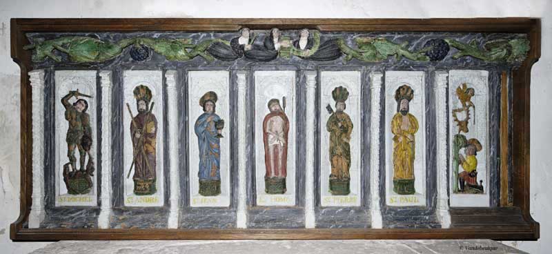 Le retable du XVIe siècle (2 m x 0.84 m) , bois taillé polychrome.