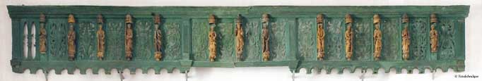 Au fond de la nef, accroché au dessus du portail, un entablement en bois datant du XVIe siècle et provenant de l'ancienne clôture de choeur (classé le 30 décembre 1904). L'ensemble mesure 7,7 m de large et 0,9 m de hauteur. Il s'agit d'une frise portant les statuettes du Christ et des douzes apôtres, posées chacune sur un piedestal et abritées sous un dais. Entre elles, des panneaux ajourés, ornés de motifs variés et tous différents, dans le goût de la Renaissance. | |||||||||||||||||||||||||||||||||||||||||||||