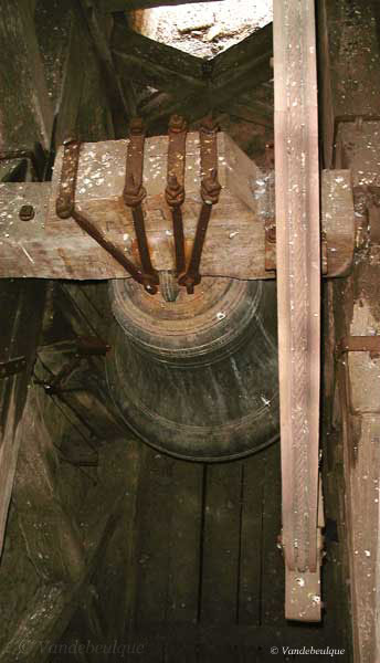 La cloche de l'église de Bransles avec, à droite, la roue qui la faisait pivoter. Aujourd'hui elle est heurtée par un marteau commandé mécaniquement par l'horloge.