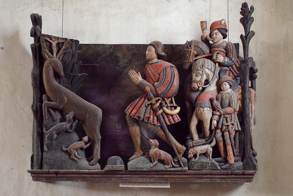 La Vision de saint Hubert, bois polychrome en ronde bosse daté de 1616