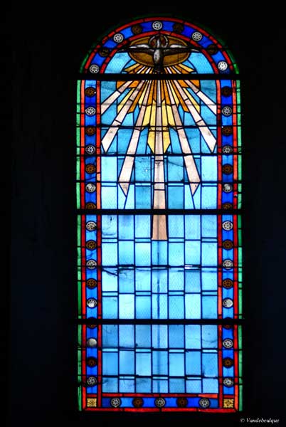 Saint Esprit rescapé du vitrail d'origine, intégré dans un vitrail contemporain.