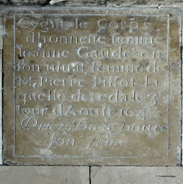 Cy gist le corps d'honnête femme Jeanne Gaudé en son vivant femme de M. Pierre Pillot laquelle décéda le 3e jour d'aout 1647 Priez Dieu pour son âme