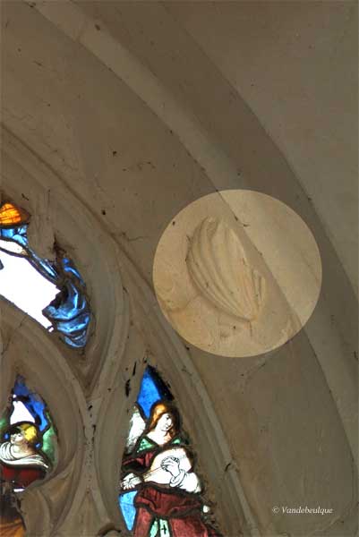 La coquille Saint-Jacques sculptée correspond au bourdon et à la besace de la pierre extérieure.