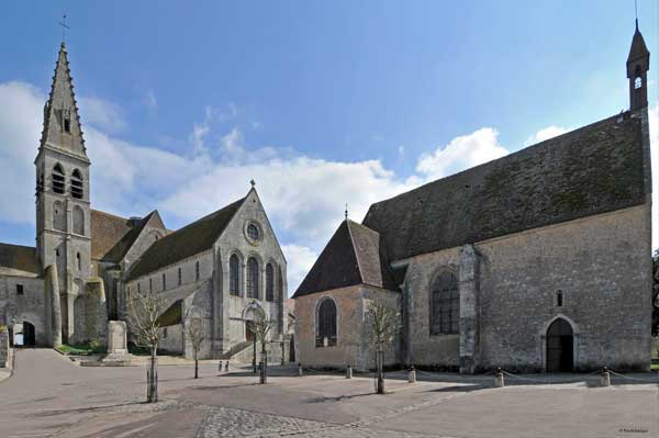 La place des Eglises : au fond, la porte Saint-Michel, le clocher et l'abbatiale