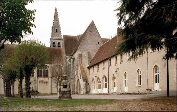 La Cour de l'abbaye avec le faux puits. Au fond, l'abbatiale, à droite, les bâtiments conventuels : salle du chapitre et refectoire des moines.
