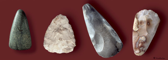 hache néolithique polie en roche étrangère, biface paléolithique, haches néolithiques polies en roches locales.