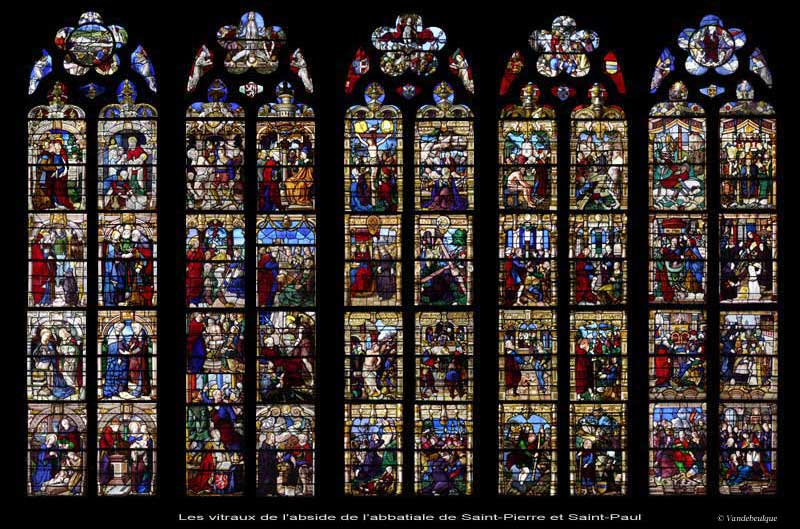 L'ensemble des cinq baies de l'abside. Détails, scène par scène, sur : www.ferrieres-en-gatinais.info, chap. "Les églises/Les vitraux"