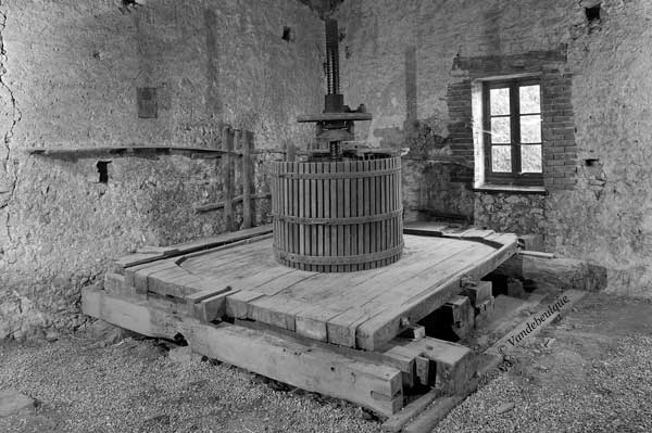 La maie ancienne, avec sa goulotte, sur laquelle a été posé un pressoir du XIXe siècle