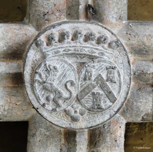 Clef de voûte de la première travée. A gauche : armoiries de Benigne du Trousset d'Héricourt A droite, celles de son épouse : Marguerite Bouzitat de Courcelles