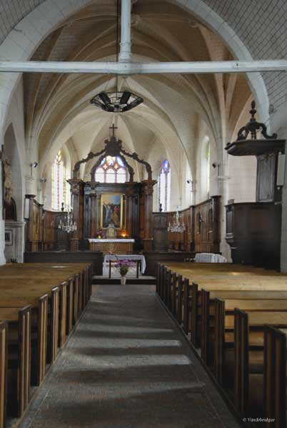 La nef avec l'imposant retable du choeur et ses boiseries.