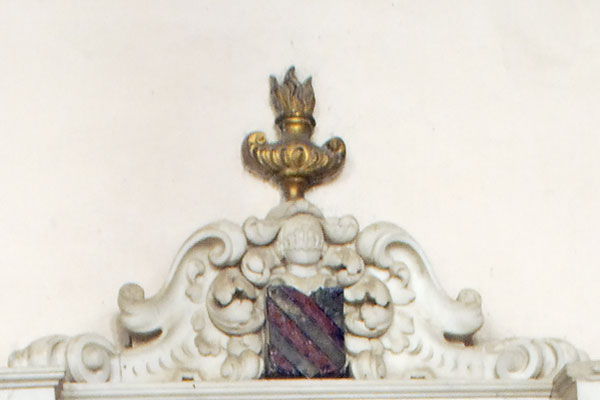 Le fronton du monument funéraire de Pierre Dauvet, marbre blanc et écusson de bronze avec les armes du défunt