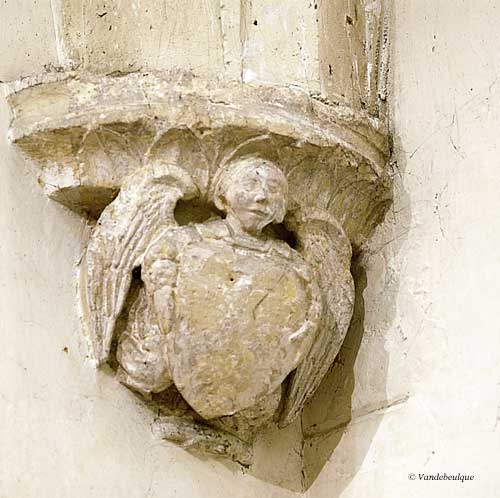 Cul de lampe ressemblant au motif sculpté d'un angle de contrefort du clocher. (même frise, entre autre)