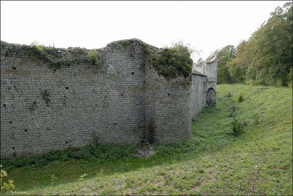 Au fond, une tour à mâchicoulis et son contrefort très particulier