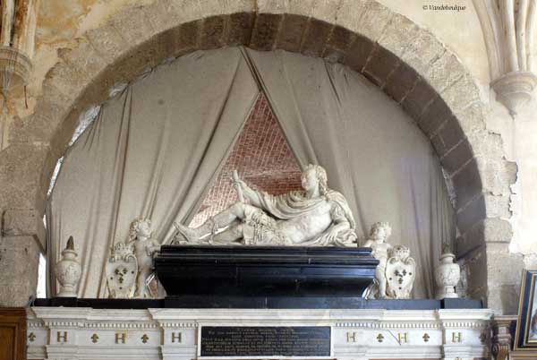 La partie supérieure du mausolée du Prince de Condé. Le cénotaphe, encadré de deux petits génies tenant les armoiries des Condé.