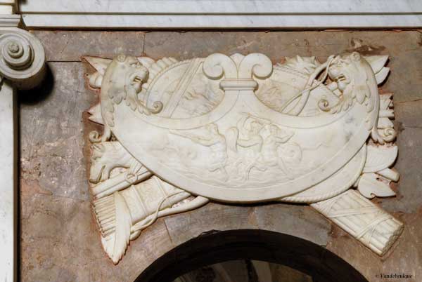 Proue de navire devant laquelle deux tritons se livrent combat pour une néréïde. A l'arrière-plan des armes antiques.