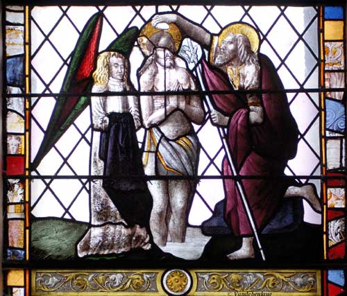 Le baptême de Jésus : ecce agnus dei (écrit sur le phylactère accroché au bâton de Jean-Baptiste) détail