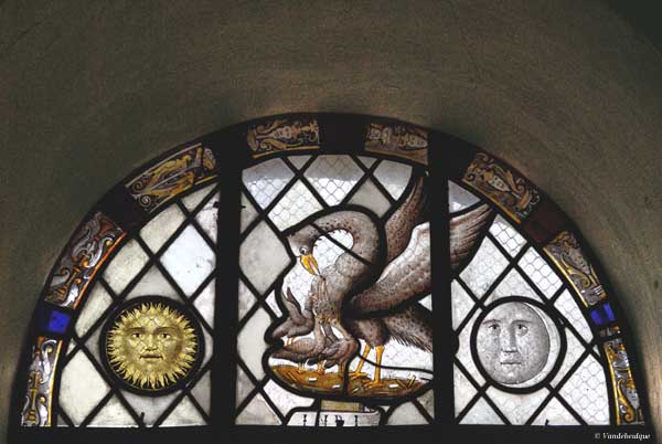 Le pélican, qui symbolise le Christ, s'ouvrant le poitrail pour nourrir ses petits. De part et d'autre : le soleil et la lune