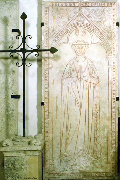 Ci gist marie fille fev girard dov vav de vileroi laqvele fu morte en lan de grace m cc xx et xix iiii lov qvinj de octovre priez povr lvi tvit et totes amen