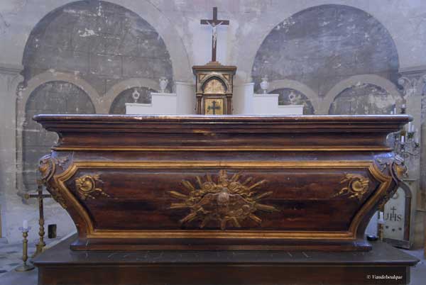 L'autel en bois peint doré ; derrière, adossé au mur, le tabernacle.