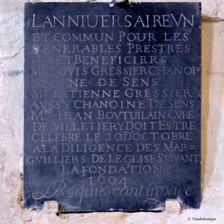 ET COMMUN POUR LES VENERABLES PRESTRES ET BENEFICIERS Mre LOUIS GRESSIER CHANOI- NE DE SENS Mre ESTIENNE GRESSIER AUSSI CHANOINE DE SENS Mre JEAN BOUTUILAIN CURE DE VILLETHIERRY DOIT ESTRE CELEBRE LE 20 D'OCTOBRE A LA DILIGENCE DES MAR- GUILLIERS DE L'EGLISE SUIVANT LA FONDATION 1694 Requiescant in pace |