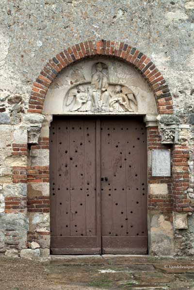 Le portail principal qui conserve deux chapiteaux, l'un à feuilles d'acanthe, l'autre sculpté de rinceaux perlés.