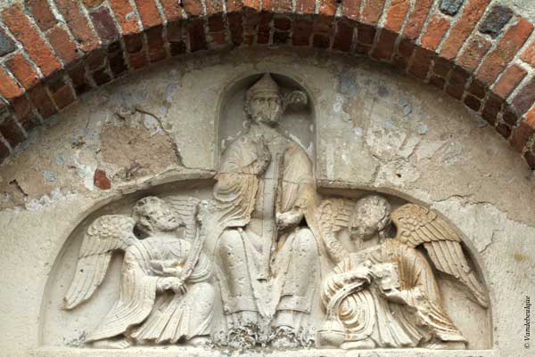 Tympan du portail : évêque avec crosse et mitre (probablement saint Loup), encensé par deux anges